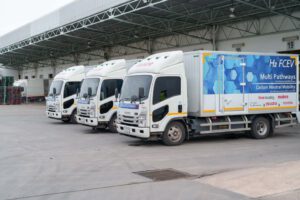 สำหรับ “โซลูชันด้านการเดินทาง” หลังจากที่ โตโยต้า มีการเปิดตัวยานพาหนะที่มีความหลากหลาย รวมทั้งรถบรรทุกที่ใช้พลังงานไฟฟ้าแบบเซลล์เชื้อเพลิง (FCEVs) รถกระบะไฟฟ้าต้นแบบ Hilux Revo BEV Concept รถ Japan Taxi LPG-HEV และรถตู้ขนาดเล็กเพื่อการพาณิชย์ (Kei) โดยการใช้งานจะขึ้นอยู่กับความเหมาะสมกับการขนส่งในแต่ละประเภทและในแต่ละวัน สำหรับโครงการความร่วมมือครั้งนี้ มีการใช้รถพลังงานไฮโดรเจน และรถตู้ขนาดเล็ก ในธุรกิจค้าปลีกของ กลุ่มซีพี และเอสซีจี ซึ่งส่งผลให้สามารถลดการปล่อยคาร์บอนไดออกไซด์ได้ประมาณ68 ตันต่อปี (*2) นอกจากนี้ ยังประสบความสำเร็จในการริเริ่มการใช้โดรนไฮโดรเจนต้นแบบสำหรับหว่านเมล็ดพันธุ์ ปุ๋ย และงานอื่นๆ ในพื้นที่เกษตรของซีพี