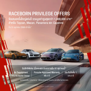 เตรียมพบกับงาน Raceborn Open House & Family Days ซึ่งจัดขึ้นโดยปอร์เช่ ประเทศไทย ระหว่างวันที่ 18 – 19 ตุลาคม 2568 ณ โชว์รูมปอร์เช่อย่างเป็นทางการพร้อมกันทุกแห่ง เตรียมมอบประสบการณ์สุดพิเศษให้แก่ผู้ชื่นชอบและผู้ที่สนใจในยนตรกรรมปอร์เช่ ภายในงานจะได้พบกับ การจัดแสดงยนตรกรรมสปอร์ตหลากหลายรุ่นในลวดลายรถแข่งในตำนาน และสำหรับผู้ที่เข้าร่วมการทดลองขับภายในงานจะได้ทดลองขับร่วมกับนักแข่งมืออาชีพและผู้เชี่ยวชาญด้านการขับขี่ที่ได้รับการรับรองจากปอร์เช่ นอกจากนี้ผู้ที่จองและรับรถในช่วงเวลาที่กำหนดจะได้ลุ้นรับแพ็คเกจร่วมขับรถสุดเอ็กซ์คลูซีฟ ณ Porsche Experience Centre กรุงโตเกียว ประเทศญี่ปุ่น* และรับข้อเสนอพิเศษแห่งปีสำหรับรุ่นมาคันน์, ไทคานน์, คาเยนน์ และพานาเมรา รวมมูลค่าสูงสุดกว่า 1 ล้านบาท สำหรับผู้ที่จองและรับมอบรถยนต์ภายใน 31 ตุลาคม 2568 เท่านั้น*
