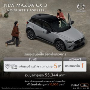 - New Mazda CX-3: ดอกเบี้ย 2.39%1, ฟรีประกันภัยชั้นหนึ่ง Mazda Premium Insurance 1 ปี2, ฟรีแพ็กเกจบำรุงรักษารถตามระยะ Mazda Care 5 ปี (รวมค่าแรง ค่าอะไหล่ และของเหลว)³ หรือ ดอกเบี้ย 1.19%1, ฟรีประกันภัยชั้นหนึ่ง Mazda Premium Insurance 1 ปี2