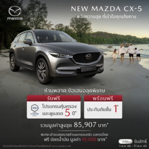 - Mazda CX-5: ดอกเบี้ย 2.39%1, ฟรีประกันภัยชั้นหนึ่ง Mazda Premium Insurance 1 ปี2, ฟรีโปรแกรมคุ้มครองและดูแลรถ 5 ปี Mazda Ultimate Service (MUS)4 หรือ ดอกเบี้ย 1.39%1, ฟรีประกันภัยชั้นหนึ่ง Mazda Premium Insurance 1 ปี2