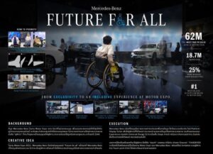 รายละเอียดแคมเปญ: ในงาน Motor Expo 2023 เมอร์เซเดส-เบนซ์ นำเสนอบูธจัดแสดงรถยนต์ ผ่านคอนเซ็ปต์ “FUTURE FOR ALL” ด้วยความตั้งใจที่จะสื่อสารจุดยืนของแบรนด์ที่ให้ความสำคัญในเรื่องความหลากหลาย (Diversity) ความเท่าเทียม (Equity) และการเคารพถึงความแตกต่าง (Inclusion) โดยดึงอินไซด์จากการสัมภาษณ์กลุ่มคนที่หลากหลาย ไม่ว่าจะเป็นผู้พิการ ผู้สูงอายุ ผู้ใช้วีลแชร์ คุณพ่อคุณแม่ที่มีลูกเล็กและมีรถเข็นเด็ก ซึ่งมีปัญหากับ “พื้นต่างระดับ” ของบูธจัดแสดงรถยนต์ ทำให้ไม่ได้รับประสบการณ์ที่ดีเท่าที่ควร เมอร์เซเดส-เบนซ์ จึงตัดสินใจออกแบบบูธใหม่เพื่อสร้างความเท่าเทียมแก่ทุกคนด้วยหลักการออกแบบ Universal Design ที่มุ่งเน้นการสร้างพื้นที่ให้ผู้เยี่ยมชมทุกคนสามารถเข้าถึงได้โดยไม่ต้องคำนึงถึงข้อจำกัด โดยปรับเปลี่ยนพื้นที่ทั้งบูธให้เป็นพื้นราบและมีทางเดินที่กว้างขวางมากพอ เพื่อความสะดวกสบายและปลอดภัยในการสัมผัสประสบการณ์สุดพิเศษภายในบูธร่วมกัน
