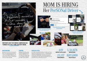 รายละเอียดแคมเปญ: ในช่วงเทศกาลวันแม่ เมอร์เซเดส-เบนซ์ ประเทศไทย ได้เปิดรับสมัครงานตำแหน่ง “คนขับรถส่วนตัว (ให้คุณแม่)” ในแพลตฟอร์มออนไลน์ของแบรนด์ โดยเป็นกิจกรรมภายใต้แคมเปญ “Momcation Test Drive” ที่จัดต่อเนื่องเป็นปีที่ 3 เพื่อสร้างช่วงเวลาที่มีคุณภาพระหว่างลูกๆ และคุณแม่ โดยล่าสุดมาในธีม “Let me be your Personal Driver” และชวนลูกๆ ที่มีใบขับขี่และรู้ว่าคุณแม่อยากจะไปเที่ยวที่ไหน สามารถที่จะพาคุณแม่ไปเที่ยวที่ไหนก็ได้ ด้วยรถยนต์เมอร์เซเดส-เบนซ์ ที่เตรียมพร้อมไว้ให้สำหรับทริปสุดพิเศษ ตลอด 5 วัน 4 คืน