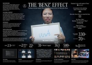 รายละเอียดแคมเปญ: เมอร์เซเดส-เบนซ์ ประเทศไทย ได้สร้างสรรค์แคมเปญที่มีคนชื่อ “เบนซ์” เข้ามามีส่วนร่วมมากที่สุด ผ่านความร่วมมือกับ BBDO Bangkok ที่ได้ดึง “เบนซ์ – ธนชาติ” ผู้กำกับหนังโฆษณาจาก Salmon House มาตามหาและนำคนชื่อ “เบนซ์” ที่มีความหลากหลายและแตกต่างกันทั้งอายุ เพศ และอาชีพ มาสัมภาษณ์ถึงที่มาของชื่อและแรงบันดาลใจของพ่อแม่รวมถึงผู้ใหญ่ในบ้านในการตั้งชื่อลูกหลานว่า “เบนซ์” และให้คนชื่อเบนซ์ทุกคน ชวนเพื่อนมาร่วมชมบูธที่งาน Motor Show 2024 โดยมีไฮไลท์พิเศษในการให้ “เบนซ์ – ธนวัต” ศิลปินนักวาดภาพประกอบที่รู้จักกันในชื่อ Bloody Hell Big Head มาร่วมสร้างสรรค์ผลงานการออกแบบภายใต้คอนเซปต์ “Icon of Inspiration” สะท้อนการเป็นแบรนด์ระดับไอคอนนิกที่อยู่คู่คนไทยมาอย่างยาวนาน โดยเป็นทั้งรถยนต์ในฝันและสัญลักษณ์แห่งแรงบันดาลใจของทุกคน