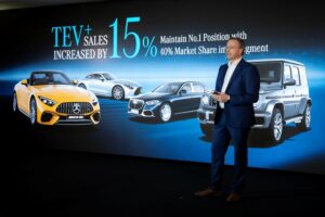 โดยในปี 2568 ที่ผ่านมา ถือเป็นปีที่สะท้อนให้เห็นถึงการเปลี่ยนผ่านเข้าสู่ยุคของรถยนต์พลังงานไฟฟ้าอย่างชัดเจน อ้างอิงจากการเติบโตของยอดขายรถยนต์พลังงานไฟฟ้า 100% และรถยนต์ปลั๊กอินไฮบริดของแบรนด์ โดยในส่วนของรถยนต์ระดับ Top-End Luxury (TEV+) มีการเปิดตัวเพิ่มเติมถึง 4 รุ่น ได้แก่ Mercedes-AMG SL 55, Mercedes-AMG GT 63, Mercedes-AMG G 63 และ G 450 d Edition STRONGER THAN THE 1980s ซึ่งสอดคล้องกับเทรนด์การเติบโตในระดับโลกของแบรนด์ Mercedes-AMG และโมเดลระดับตำนานอย่าง G-Class