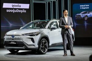 อีกหนึ่งกระแสสำคัญในประเทศไทย คือ ความนิยมในรถยนต์ประเภท SUV โดยในปีที่แล้วนั้น ส่วนแบ่งตลาดของ SUV เพิ่มขึ้นที่ 38% แม้ว่าตลาดรถยนต์รวมจะหดตัวลง 9% ทั้งนี้เนื่องมาจากประโยชน์ใช้สอยของรถ SUV เอง ที่สามารถตอบสนองรูปแบบการใช้งานอันหลากหลาย ทั้งการใช้งานในชีวิตประจำวันในรูปแบบคนเมือง จนถึงการออกไปใช้ชีวิตแบบผจญภัยในช่วงวันหยุด  ภายใต้สถานการณ์เช่นนี้ เพื่อความสำเร็จในประเทศไทยต่อไป และนำรอยยิ้มของลูกค้าชาวไทยมาให้มากขึ้น และนี่คือการเปิดตัวรอบ World Premiere ของ Corolla Cross ใหม่ ที่ได้รับการอัพเกรด เพื่อมอบความพรีเมี่ยม เหนือระดับ ด้วยการออกแบบภายนอกที่ล้ำสมัยและได้มาตรฐานของสเปกที่ต้องการ ซึ่งผมหวังอย่างยิ่งว่า โคโรลล่า ครอส ใหม่ จะได้รับการยอมรับจากลูกค้าชาวไทยเป็นอย่างดี เหมือนดังเช่นเคย”