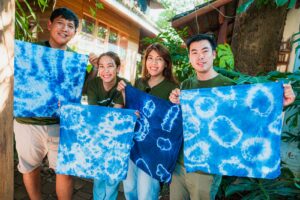 จากนั้นเดินทางต่อไปยัง “บ้านมัดใจ” บ้านเรือนไม้โอบล้อมด้วยพันธุ์ ต้นไม้น้อยใหญ่ ที่ใช้สอนย้อมฮ่อมและเป็นคาเฟ่ สไตล์โฮมเมด โดยที่นี่เราได้ทำกิจกรรม Workshop ผ้ามัดย้อมฮ่อม หรือผ้ามัดย้อมคราว สไตล์เมืองแพร่ โดยรับฟังการอธิบายวิธีสร้ างลายบนผ้าเบื้องต้น ด้วยการมัด หนีบ ด้วยหนังยาง และนำไปจุ่มในม่อฮ่อนสีน้ำเงิน โดยเลือกสีอ่อน เข้มได้ ตามระยะเวลาในการจุ่มผ้า แม้เป็นกิจกรรมช่วงสั้นๆ แต่สร้างความสนุกสนานและตื่นเต้ นกับการเห็นลวดลายบนผ้าในสไตล์ ตัวเองที่มีผืนเดียวในโลก