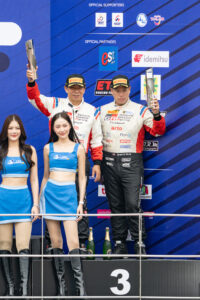 ด้านรถหมายเลข 9 ขับโดย แมน-ณัฐพงษ์ ห่อทองคำ และ ต้น-มานัต กุละปาลานนท์ แท็กทีมผลัดกันหวดไม่ออมมือ คว้าโพเดียมในรุ่น Supercar GTM Pro-AM ในอันดับ 2